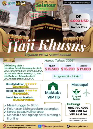 Selatour Pekanbaru menyediakan pembimbing yang berpengalaman dan profesional untuk memastikan ibadah Anda sesuai sunnah.
