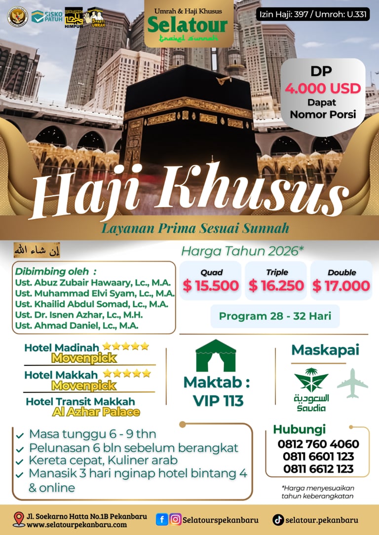 Jangan lewatkan kesempatan berharga ini untuk menunaikan ibadah haji sesuai sunnah bersama Selatour. Pastikan Anda dan keluarga menjadi bagian dari perjalanan spiritual yang penuh berkah ini.